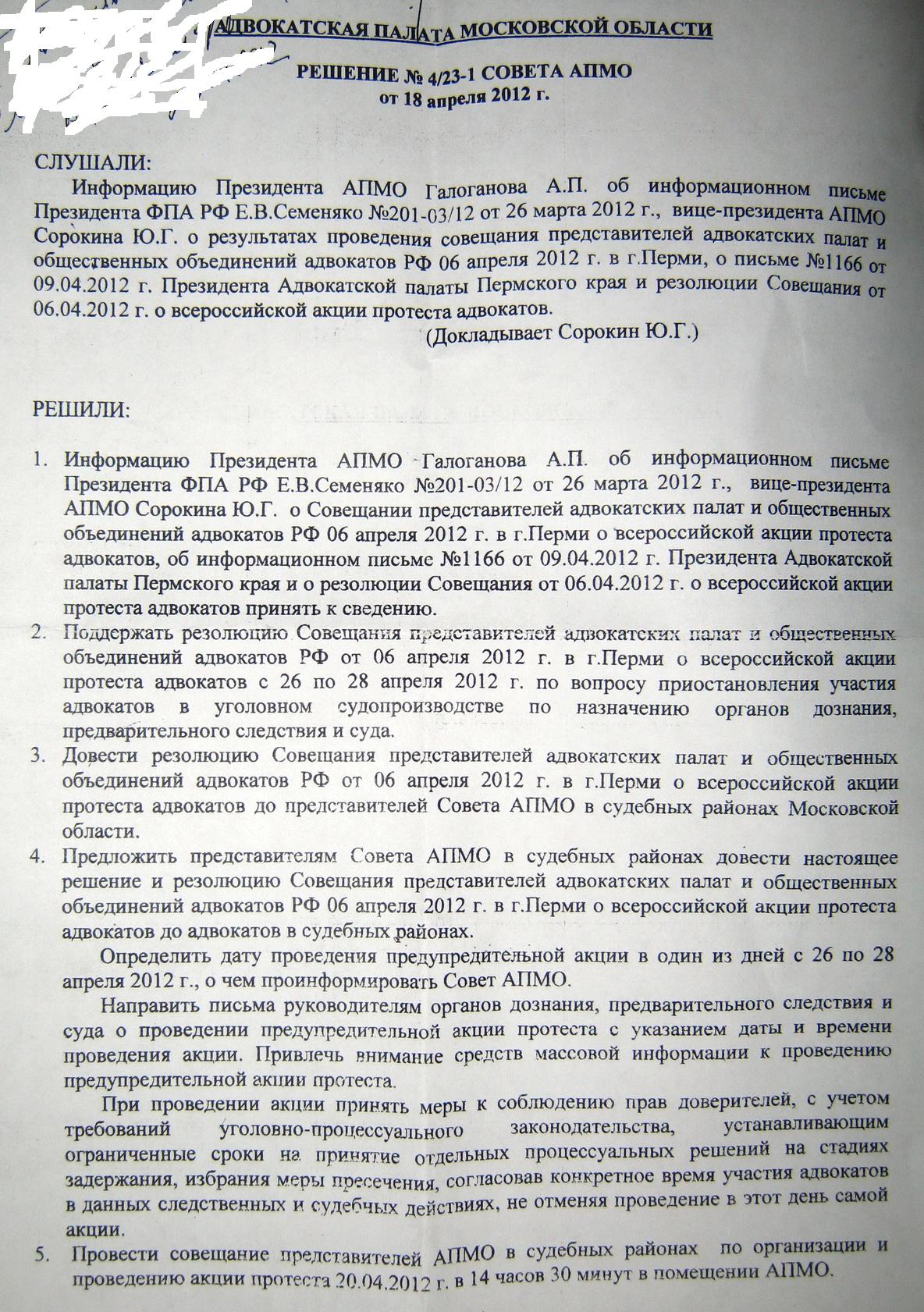 На взгляд участников совещания, на данном этапе принципиальное значение имеет не столько реальное осуществление протестных акций адвокатов в отдельных регионах, сколько угроза таких акций и возможность прибегнуть к всероссийской акции всего сообщества. Представляется, что эта угроза могла бы быть реализована в случае непринятия в оговоренные сроки указанного постановления Правительства РФ.