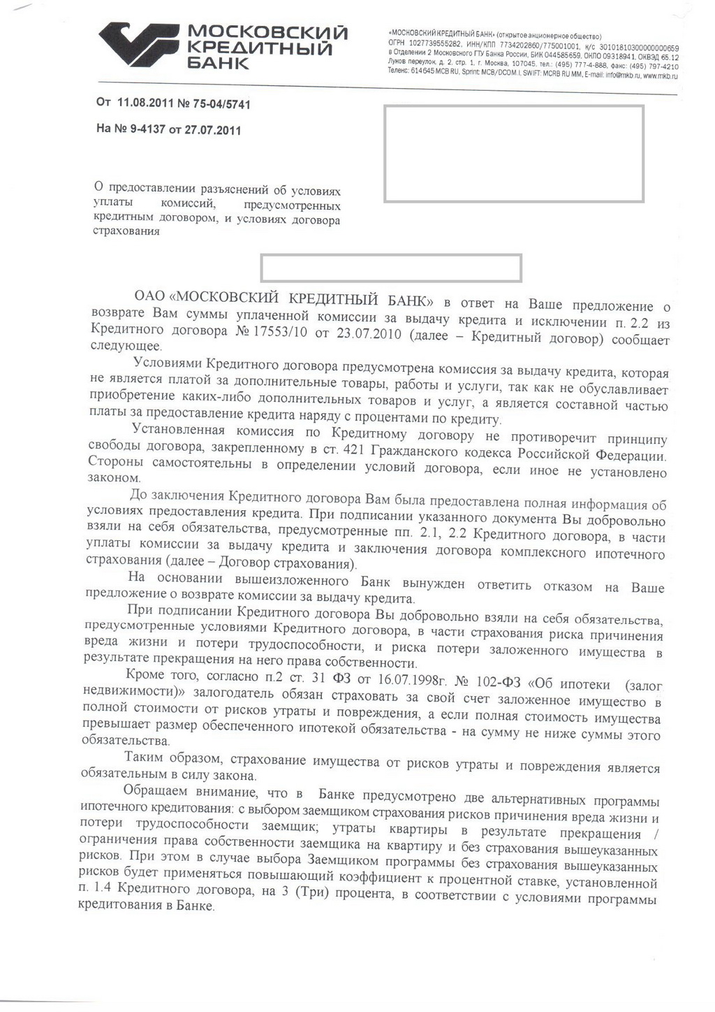 Наша позиция относительно комиссии за обслуживание кредита следующая: