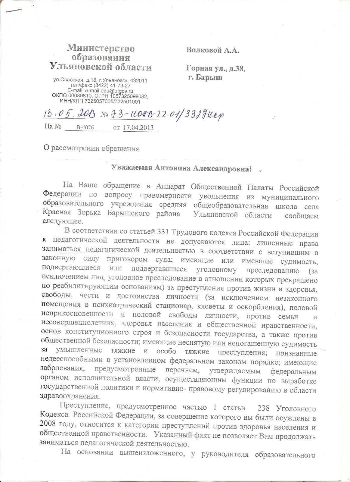 Лилия, а откуда директору стало известно про статью 238 УК? Что этому предществовало? Представление прокурора или что? Спавку о судимости брали?Вчера пришёл ответ из Министерства образования Ульяновской области. Только мне кажется, их ответ противоречив, даже в самом тексте письма. А сегодня директор объявила, что до конца учебного года обязана будет меня уволить, т.к. за неисполнение приказа прокуратура наложит штраф на неё.