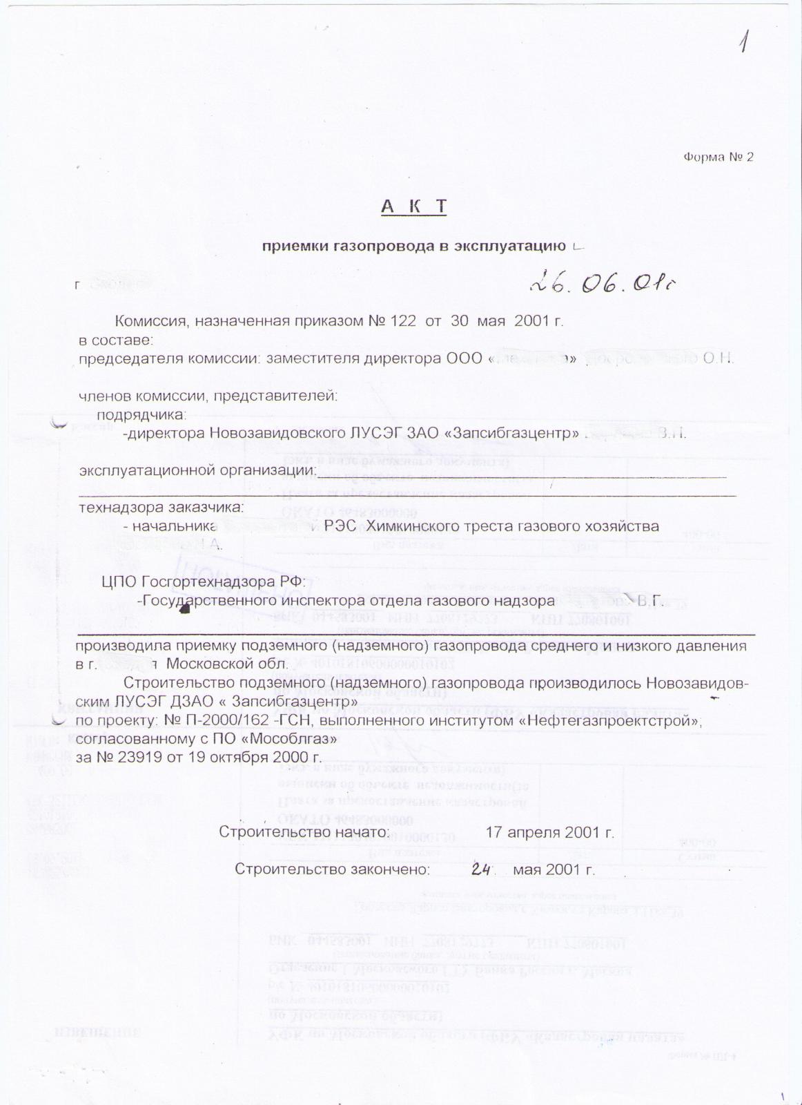 V.R.I. спасибо вам большое человеческое! Посмотрите, нашла разъяснения ГУФРС по МО, содержащееся в Информационном письме от 10.07.2006г. Пункт 1 статьи 25 Федерального закона устанавливает, что основанием для государственной регистрации прав на созданный объект недвижимого имущества является документ, подтверждающий факт его создания. Следовательно, на государственную регистрацию должен быть представлен акт приемки объекта в эксплуатацию, подписанный всеми членами приемочной комиссии, по объектам газового хозяйства, законченным строительством до введения в действие 30.12.2004 нового Градостроительного кодекса Российской Федерации (далее - Градостроительный кодекс), а для объектов, завершенных строительством после 30.12.2004, в соответствии со статьей 55 Градостроительного кодекса - разрешение на ввод объекта в эксплуатацию, выданное соответствующим исполнительным государственным органом власти или органом местного самоуправления.