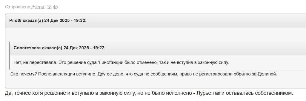 Было, конечно. Никакого перехода потому что не было. Сделку признали недействительной, она никаких правовых последствий не породила, Долина не стала вновь собственницей, она просто осталась ею, как и раньше до сделки была. Регистрация ПС Лурье в ЕГРН это такое же правовое последствие, которое считается несостоявшимся.