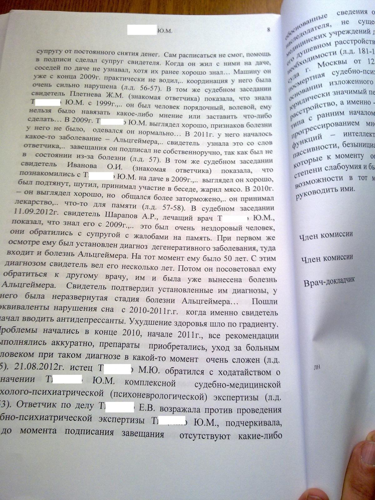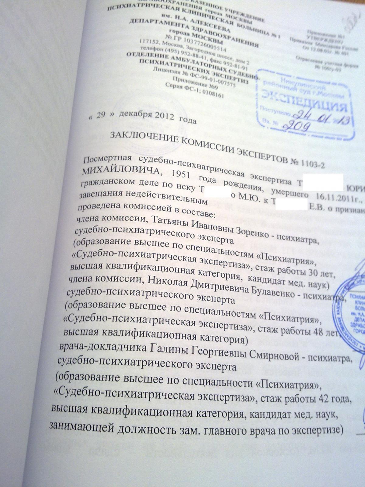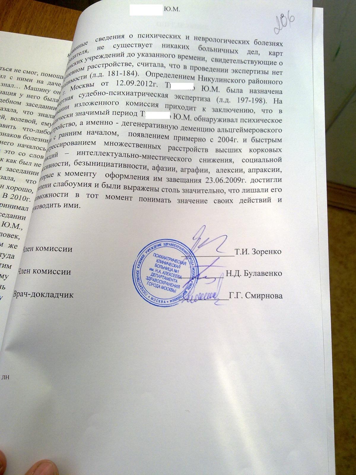 Повторю, оспаривалось завещание 2009 года. Вот читайте, что написали эксперты. Выдернули куски свидетельских показаний (в основном родственников истца), а на другие свидетельские показания (свидетелей ответчика) вообще не обратили внимания. Как и выдержки из больничных дел, которые вообще начинаются по времени после составления завещания. Сам был в шоке от такой экспертизы. В подобных случаях, когда нет медицинской документации в юридически значимый период времени, эксперты, а потом суды обычно трактовали это в пользу ответчиков.