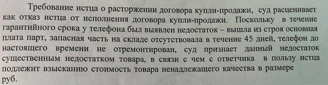 Серьезно, давайте конкретнее. А лучше скан решения выложите, а то действительно не понятно в датах и суммах что и как. Да и вопрос о "легальности" авторизованности АСЦ остается открытым.Потом был суд, который взыскал цену товара, неутойку, КМВ и судебные расходы.