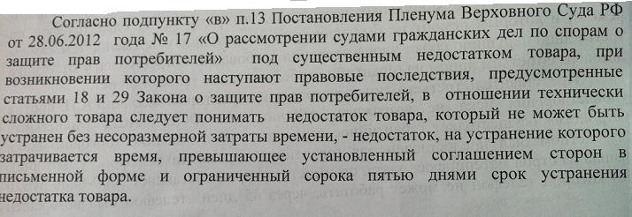 Товар стоит 14 тысяч. Потреб пришел к продавцу, а те его отправили в сторонний АСЦ, хотя могли и сами принять в ремонт. Но это истец никак не смог и не сможет доказать (мало ли что там сказали). Сдал товар в ремонт в СЦ. Там он пролежал два месяца. Потреб забрал из СЦ товар вместе с тех. заключением (см. выше). Дальше к продавцу с требованием о возврате денег, где ему отказали, т.к. товар сложно-технический и могли принять только в ремонт. Позде потреб пошел в суд и стал истцом...