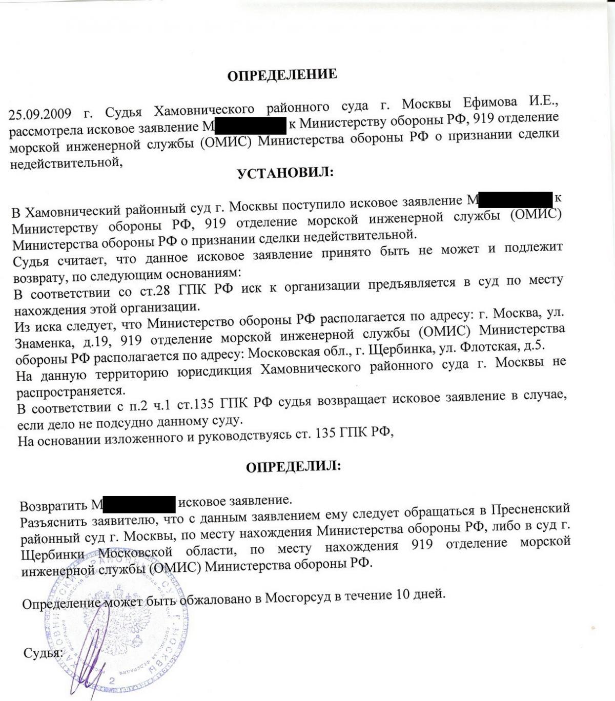Этой мульке уже хрен знает сколько лет. Где-то в конце 2009 - начале 2010 я специально обращался в московское управление СД при ВС РФ с вопросом - см. файл письма. Эти дебилы прислали ответ, что подсудность определяется таким-то НПА - и указали НПА, которым определяется подсудность мировых судей Москвы. К сожалению, скана ответа нет под рукой. Была мысль написать непосредственно в СД при ВС РФ, что в московском управлении работают дебилы, но как-то руки не дошли. В общем-то, можно и сейчас это сделать. Не знаю, что сейчас, но тогда этот адрес вроде бы относился к Пресненскому суду - см. файл определения. Во всяком случае, наш иск был рассмотрен Пресненским судом...Москва, Знаменка, 19 - нет ни в одной базе.