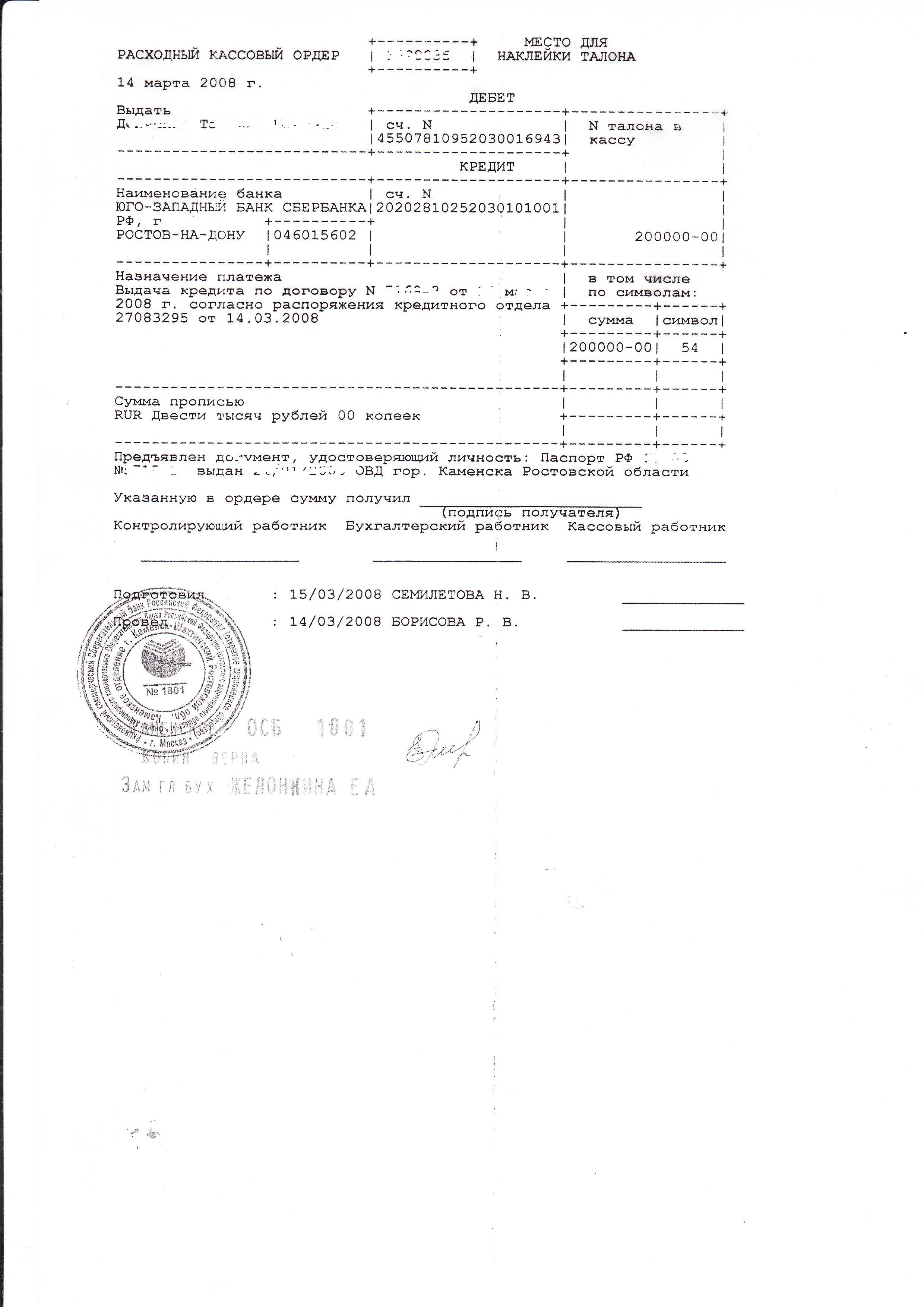 Согласно расходному кассовому ордеру N 112835 от 15 декабря 2011 года, представленного банком, Л.Д.В. получены в ЗАО "Вэлкомбанк" денежные средств в сумме ....... рублей (л.д. 20).