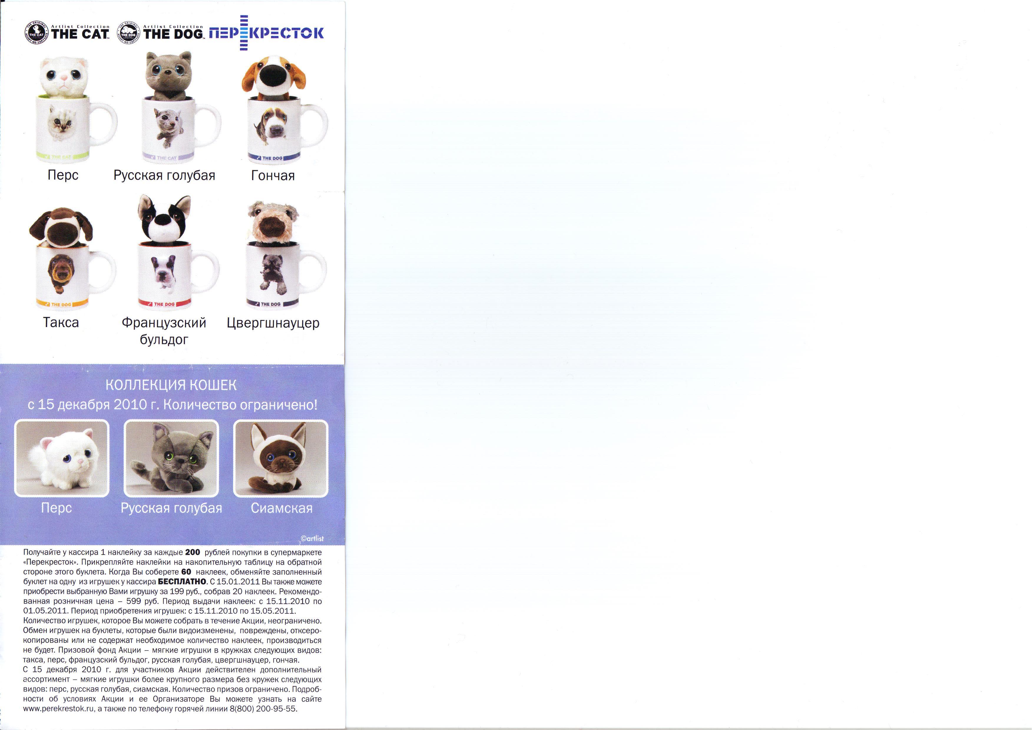 В декабре 2010 г., находясь на территории торгового зала магазина « Перекрёсток », расположенного ул. Домодедовская д. 12, я принял участие в акции « Игрушка в кружке » - на кассе магазина мне был выдан буклет, содержащий условия акции, а именно: получать у кассира 1 наклейку за каждые 200 рублей покупки в супермаркете «Перекрёсток», прикреплять наклейки на накопительную таблицу на обратной стороне буклета, собрать 60 наклеек и бесплатно обменять у кассира заполненный буклет на одну из игрушек, изображения которых имеются в буклете. Период выдачи наклеек определён с 15.11.2010г. по 01.05.2011г., а период приобретения игрушек определён с 15.11.2010г. . по 15.05.2011г.. Рекомендованная розничная цена игрушки указана в буклете равной 599 рублей. Указанные обстоятельства подтверждаю приложенным оригиналом буклета с наклеенными на него 60 наклейками.