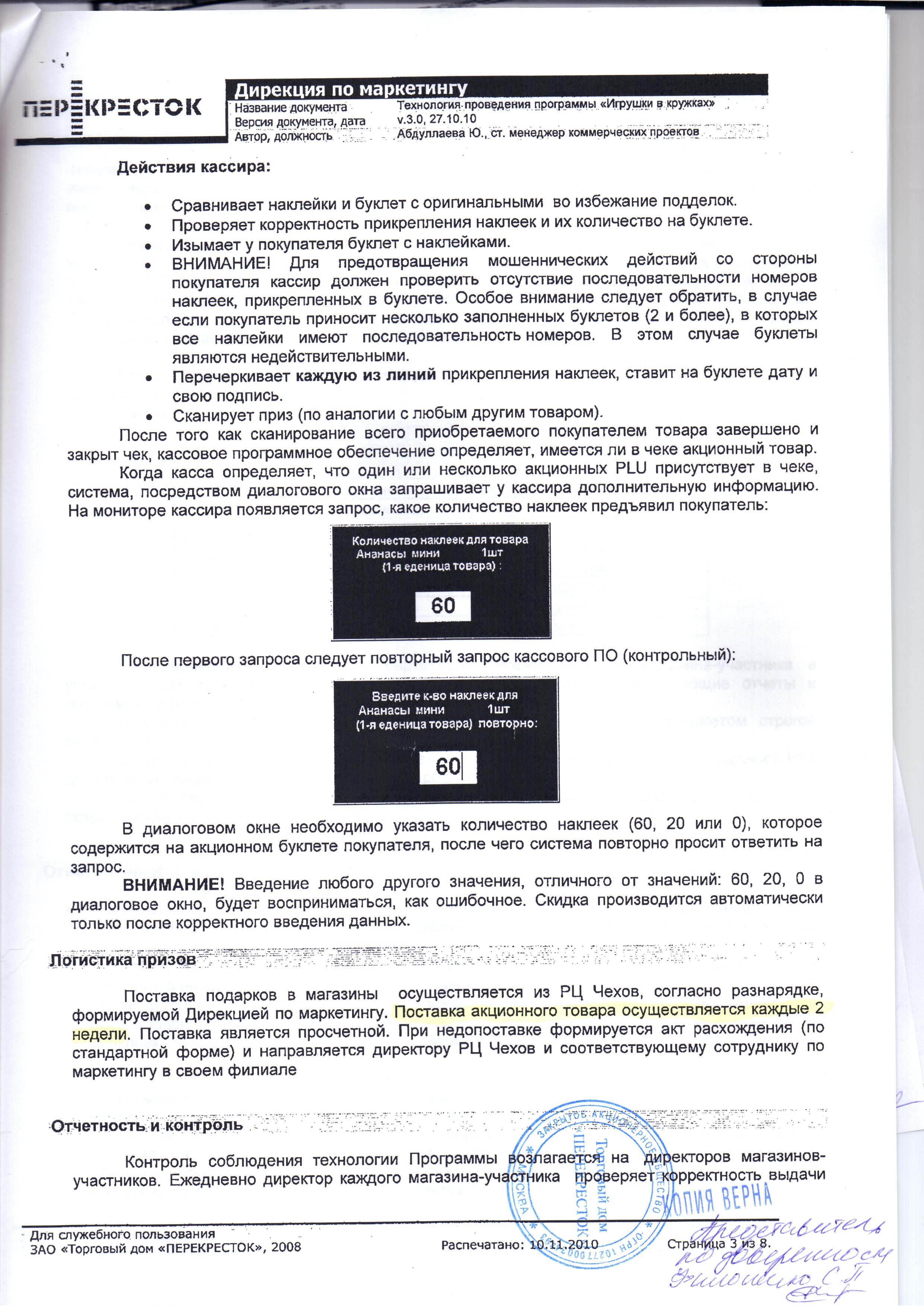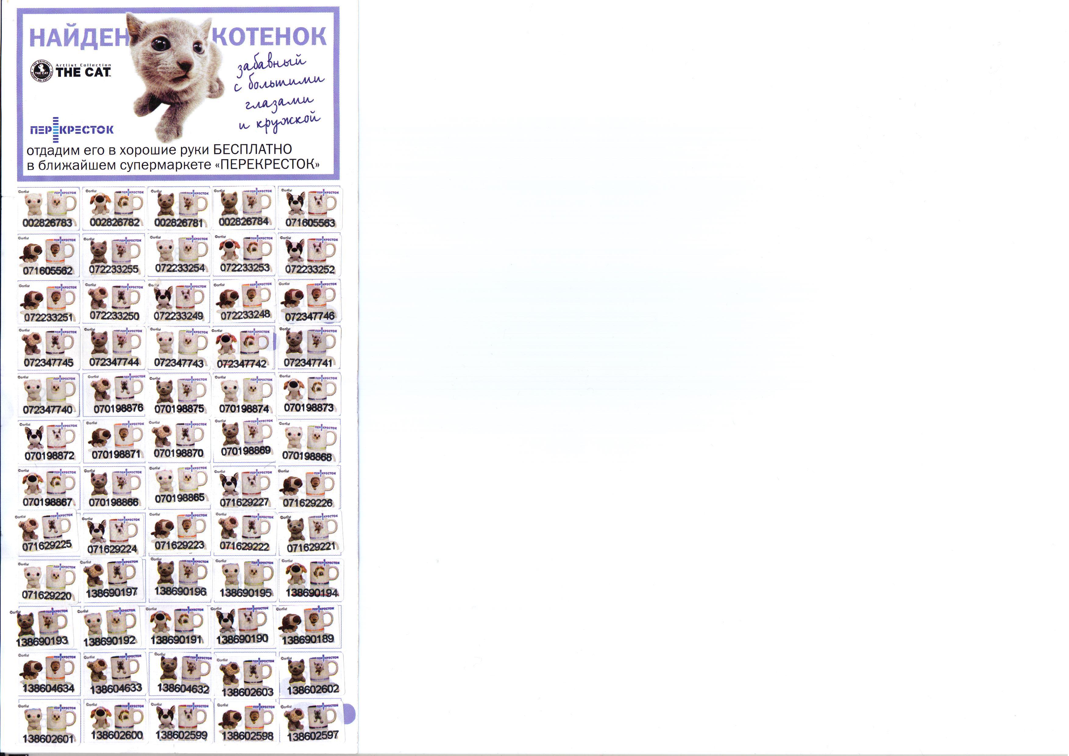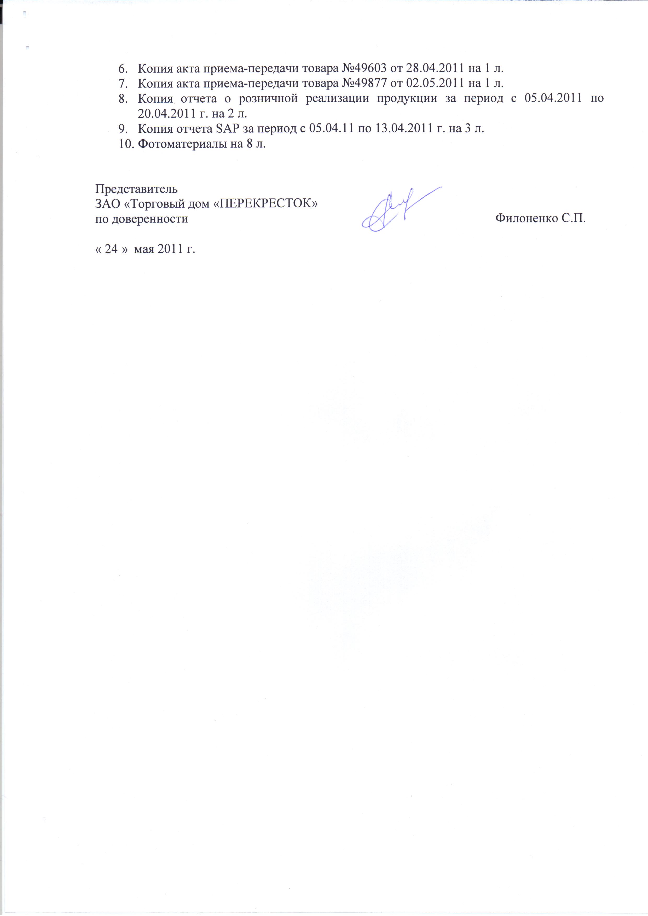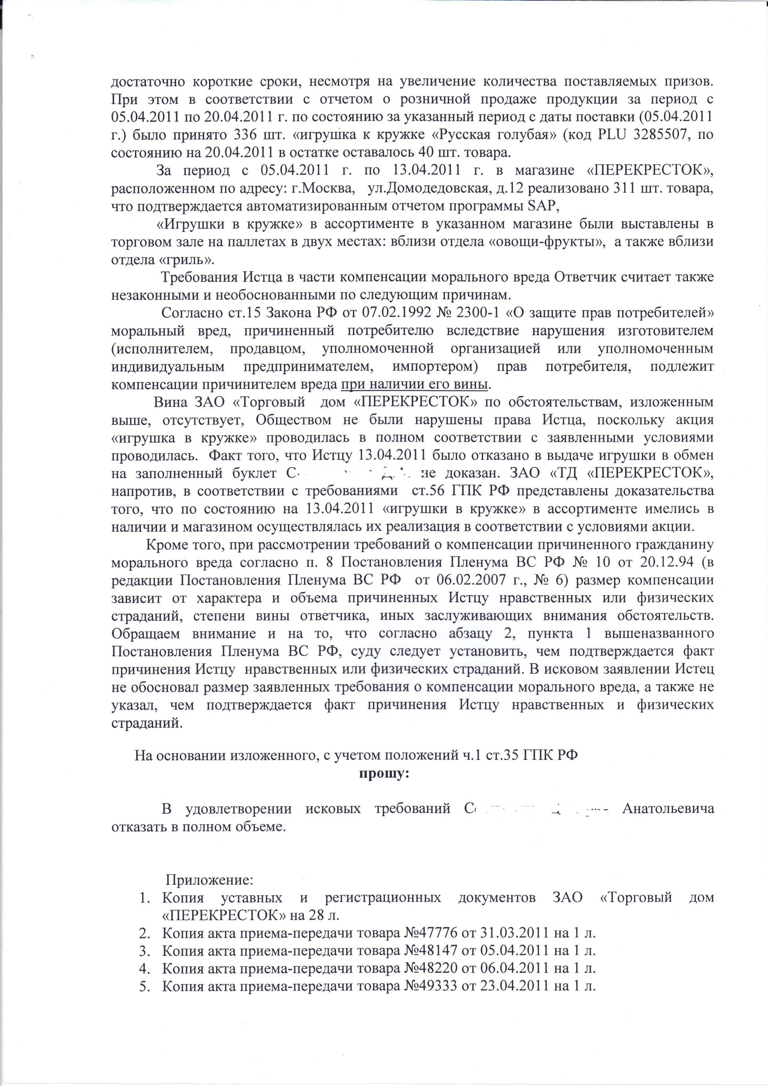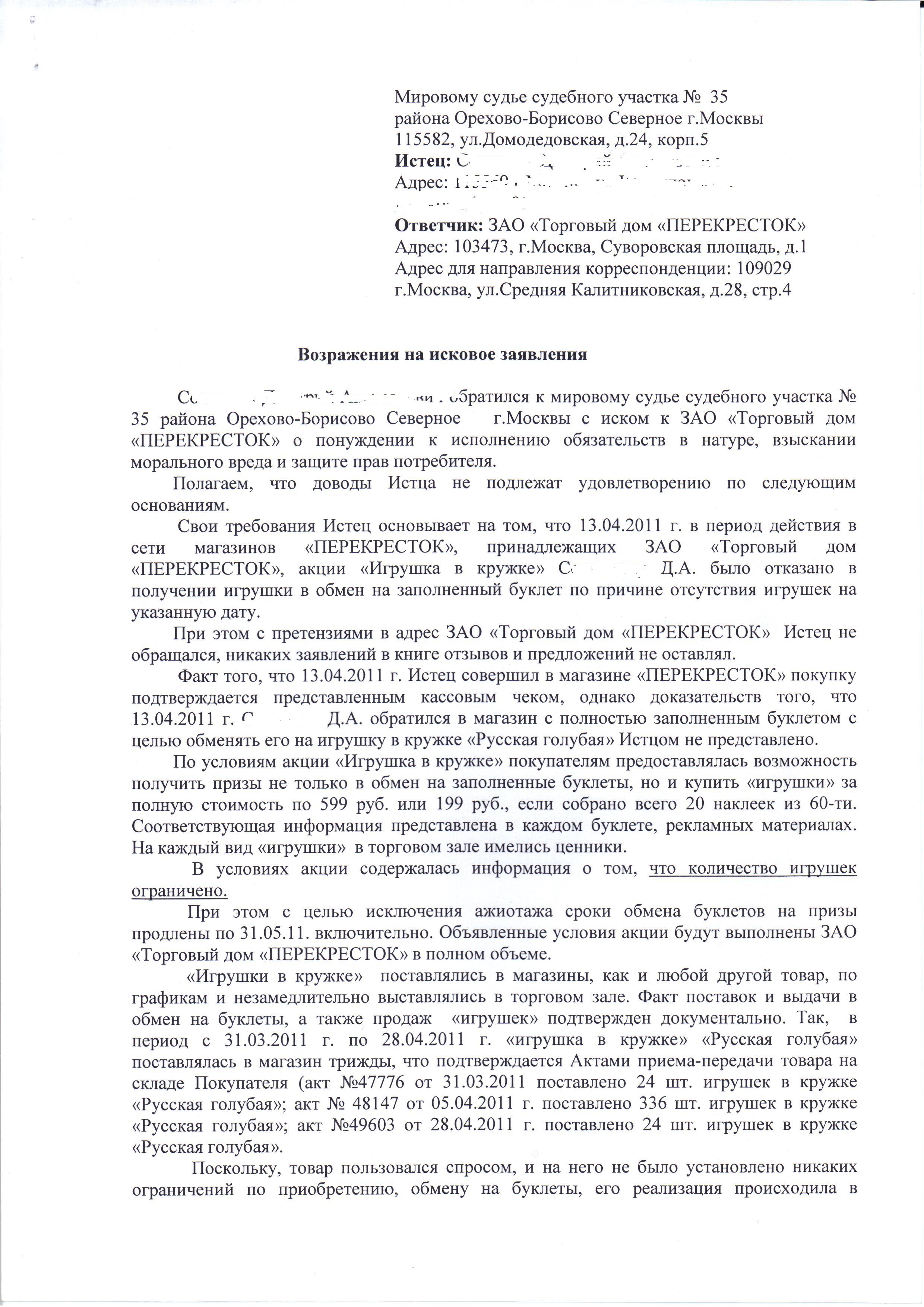 К 13 апреля 2011г., т.е. в период приобретения игрушек, я обратился на кассу магазина « Перекрёсток », расположенного ул. Домодедовская д. 12, для получения игрушки в кружке « Русская голубая », однако мне было в этом отказано по причине отсутствия игрушек, при этом мне за покупку была выдана очередная наклейка. Указанное обстоятельство подтверждаю приложенным кассовым чеком от 13.04.2011г., наклейкой.
