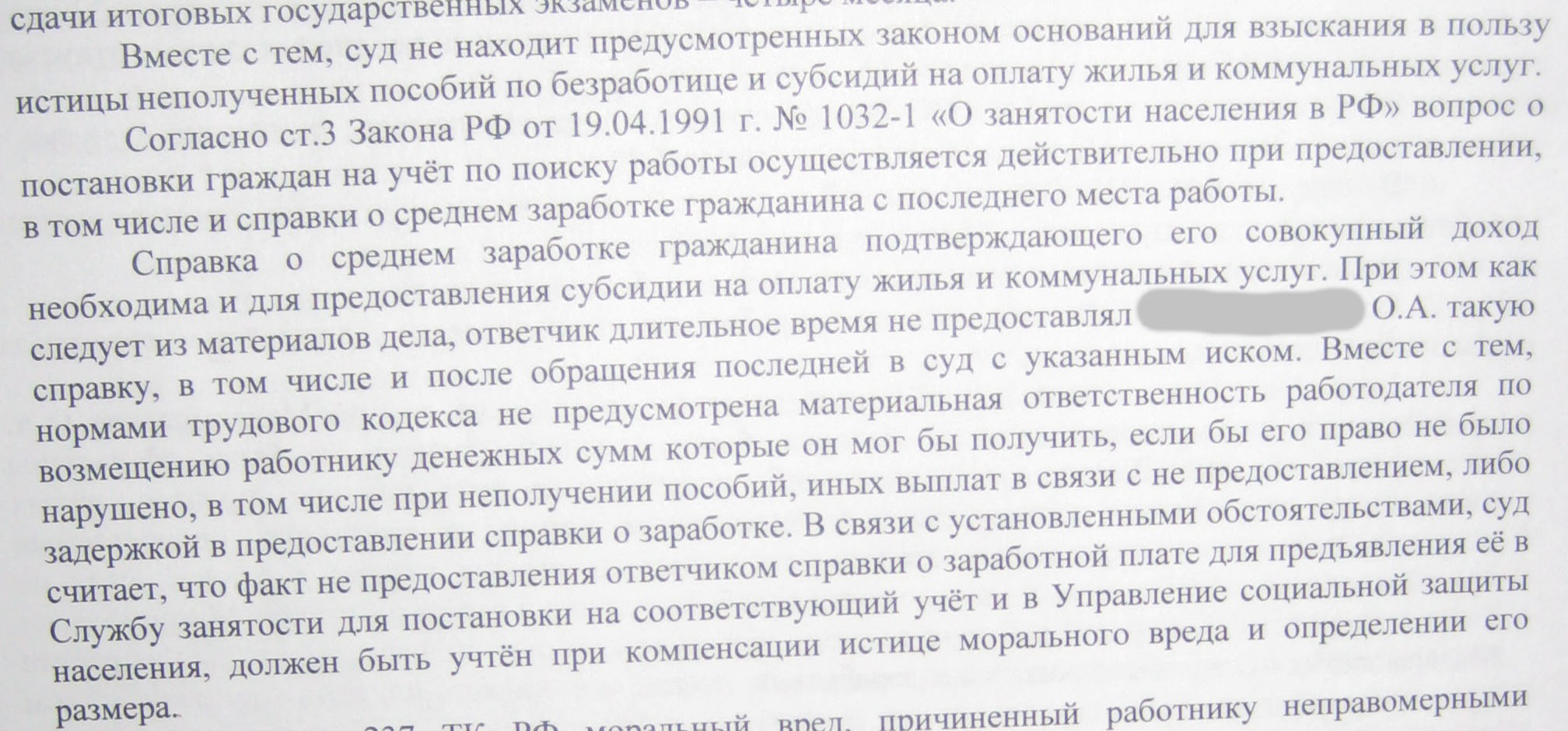 В день увольнения и в последующие дни, несмотря на устные и письменные заявления, Ответчиком не была предоставлена справка о доходах Истца. Данная справка необходима была Истцу для постановки на учет в качестве безработного и получения пособия по безработице, а также для оформления субсидии на оплату жилья и коммунальных услуг (далее – «субсидия»).
