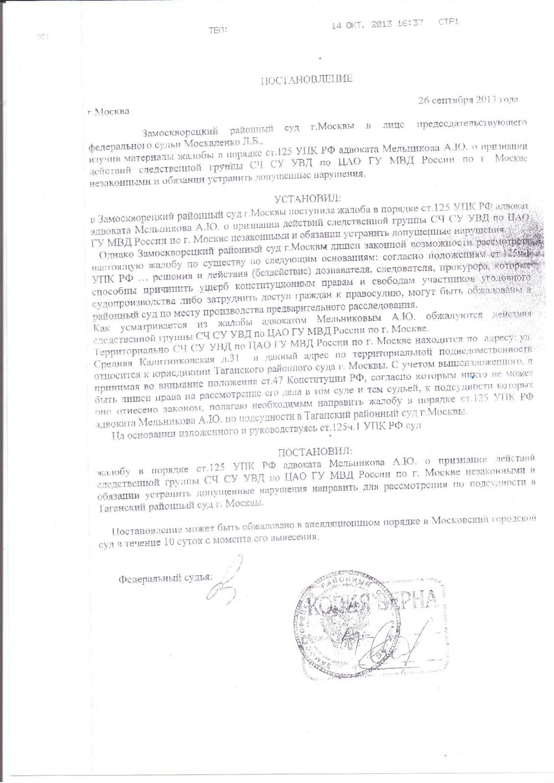 В тоже время, жалоба, поданная в интересах одного из обвиняемых (по другому уголовному делу) по месту совершения преступления в Замоскворецкий районный суд г. Москвы, определением судьи была направлена в Таганаский районный суд г. Москвы.В определении суда было указано, что жалоба в порядке ст. 125 УПК РФ может быть рассмотрена судом по месту проведения предварительного следствия. В данном случае также обжаловались действия следователей УВД по ЦАО ГУ МВД РФ по г. Москве.