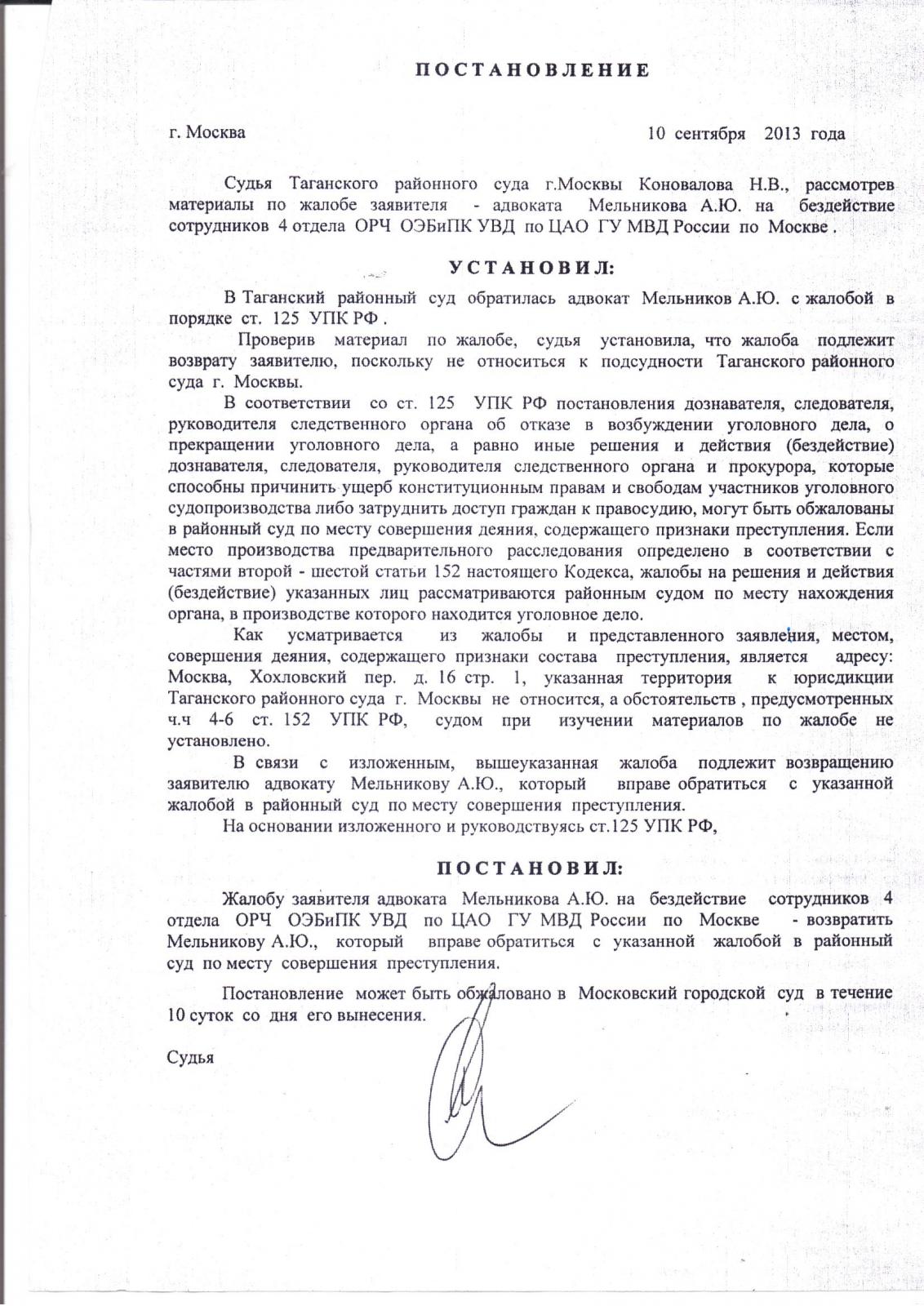 Жалоба в порядке ст. 125 УПК РФ, поданная в интересах потерпевшей, была возвращена Таганским районным судом Москвы с указанием на то, что якобы она подсудна суду по месту совершения преступления.