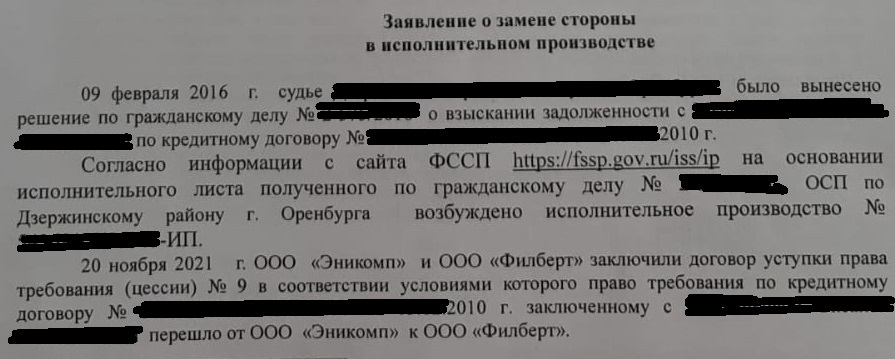 Ситуация очень странная. В 16 году банк подал в суд иск по кредиту, естественно его взыграл, получил исполнительные листы, передал их на исполнение судебным приставам которые в течении 3 месяцев списали всю сумму присужденную судом. Вчера получил повестку с суда, Филберт подал заявление о процессуальном правопреемстве по гражданскому делу от 16 года, по которому выплачена вся сумма. На сайте фспп уже нет истории по исполнительным производствам тех лет, то что деньги полностью выплачены нет никаких сомнений, т.к. в 18 году требовалось восстановить документы на авто, на которое было наложено ограничение на рег.действия в качестве меры обеспечения, в суде лично получал справку об исполнении решения суда и передал её в ГИБДД. Вопрос! На что лучше делать упор в возражении на заявление? По сути деньги хотят взять второй раз. К сожалению по прошествии лет документов уже не осталось, история усложняется еще тем что я не проживаю в городе где проходит суд. Заранее благодарен за ответы! UPD. Филберт в декабре месяца присылал бумагу о долге, сумма идентичная что и в исковых требованиях банка в суд в 2016 году.