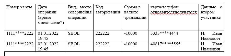 предъявляют суду распечатку, где указаны последние четыре цифры номера карты, имя (иногда также отчество) и первая буква фамилии получателя.