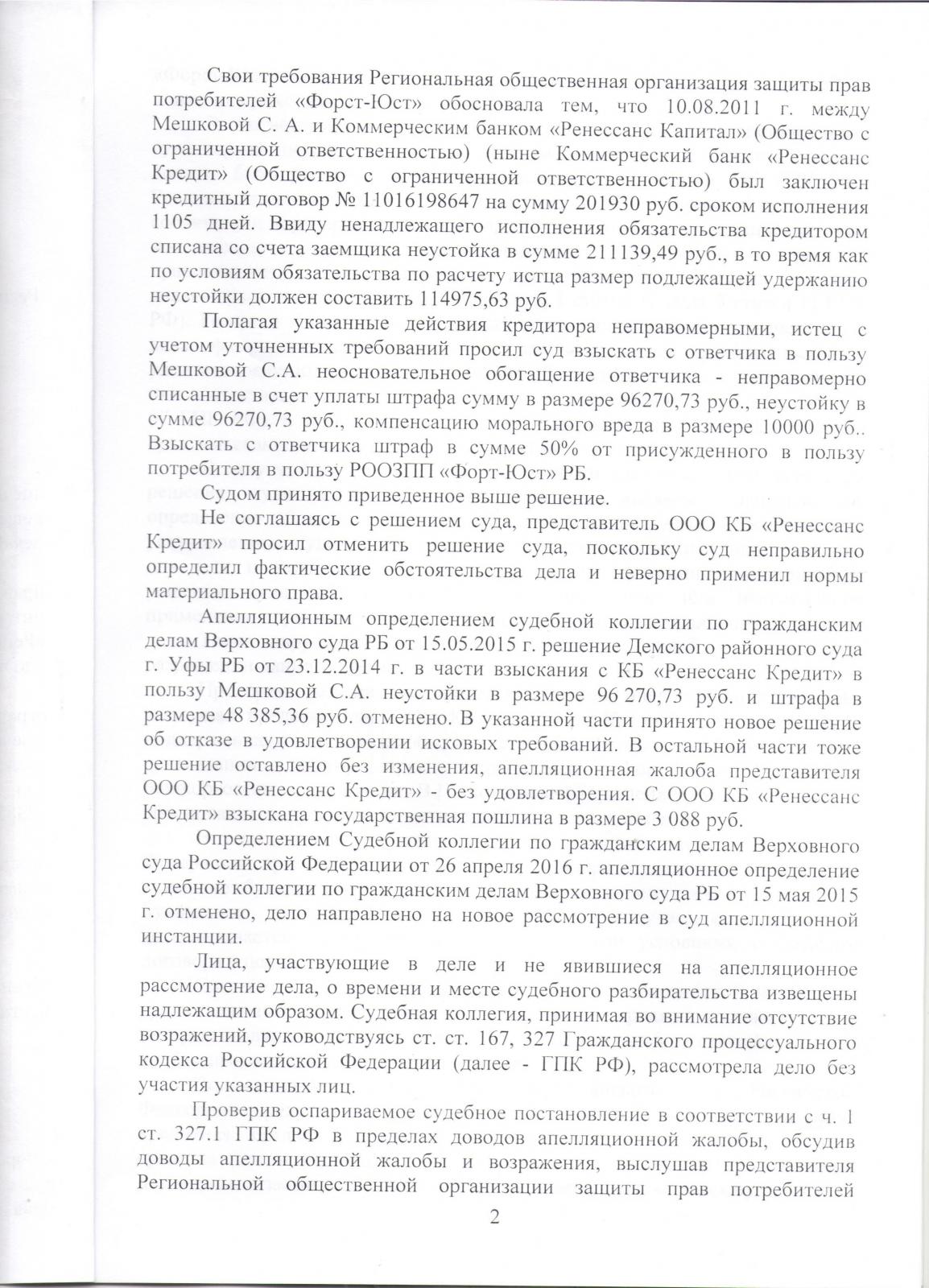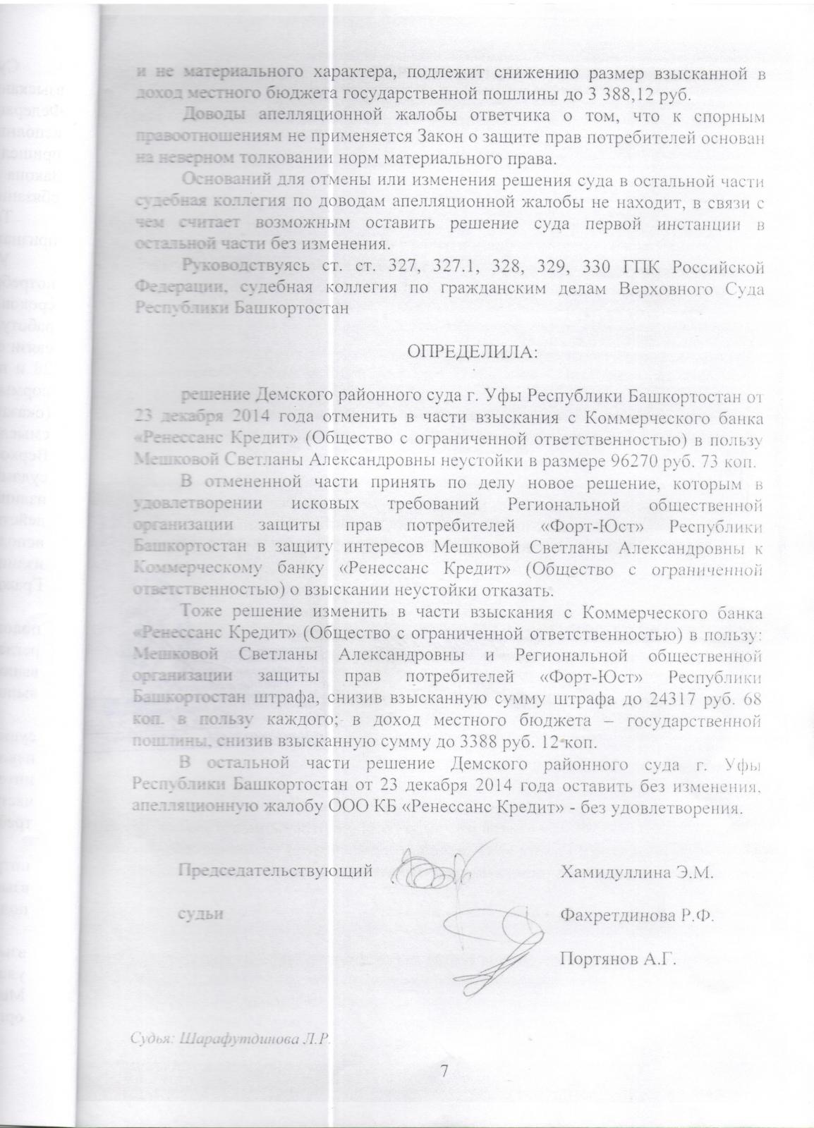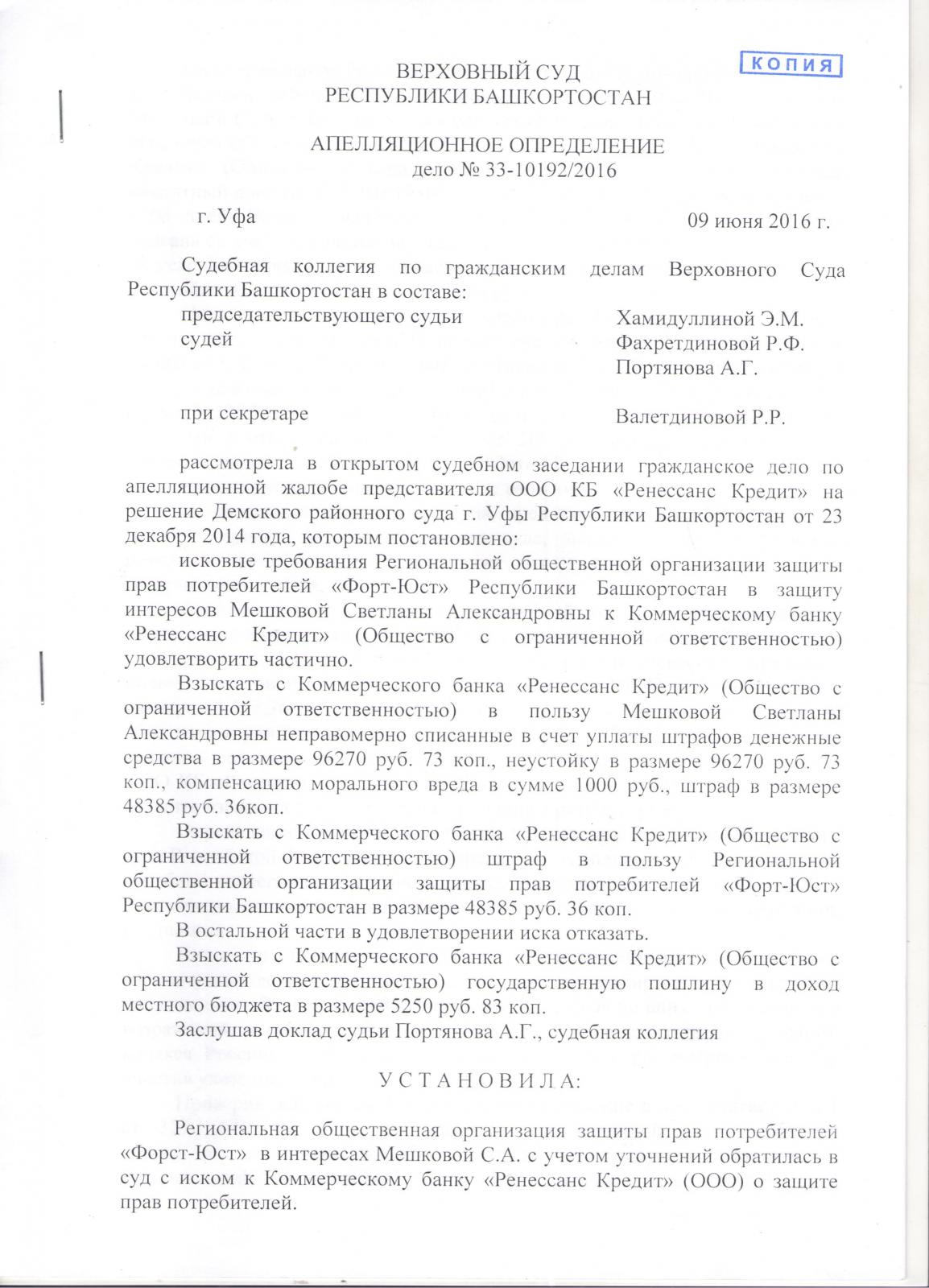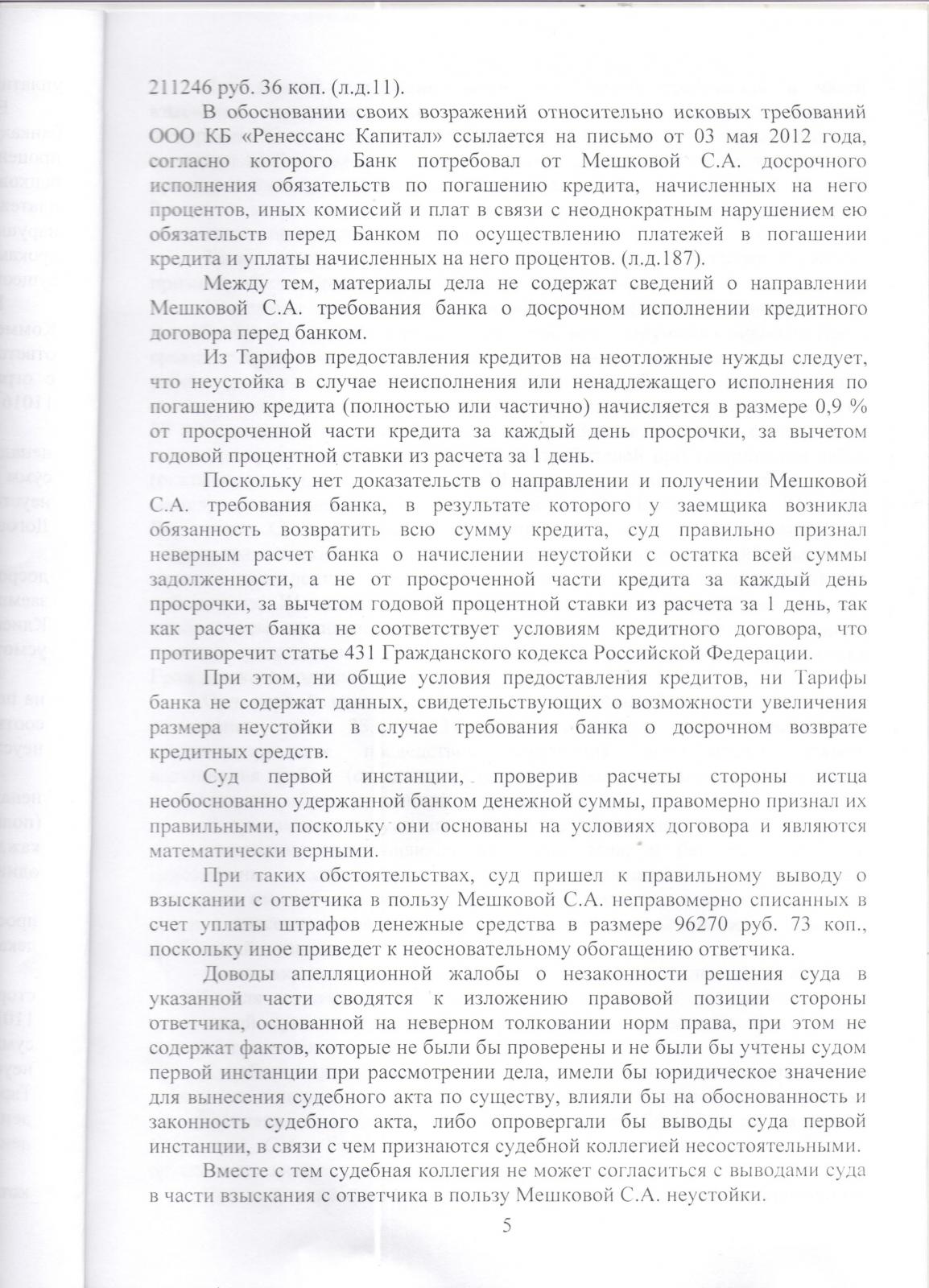 Порадовал банк, когда представил суду выписку, согласно которой деньги заемщику они вернули в день получения претензии. На вопрос коллегии, почему не в суд первой инстанции, был дан шедевральный ответ: потому что нам (банку) было важно получить мнение ВС РФ по данной категории дел, поэтому мы (банк) устно про возврат районному суду сказали, но письменные доки не стали давать в надежде получить квалифицированное мнение ВС РФ