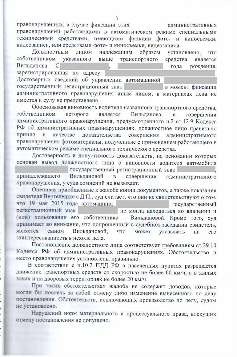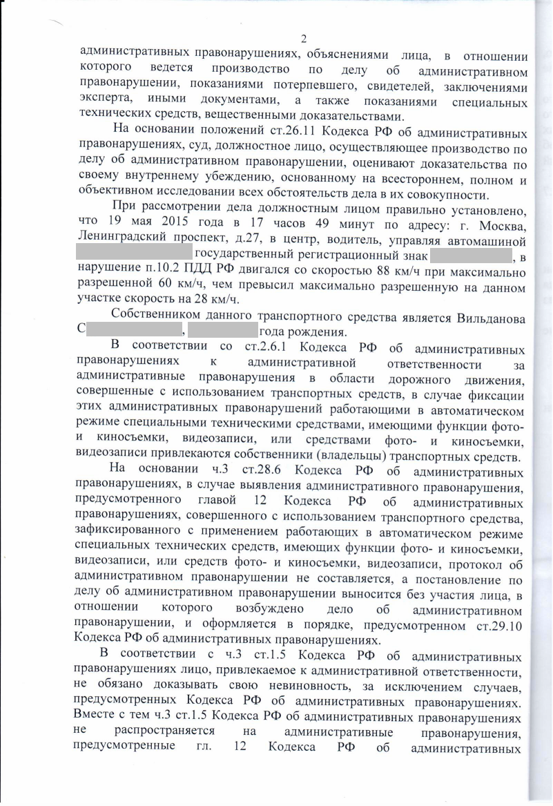 5 июня 2015 года по почте пришёл штраф с камеры. В момент фиксации превышения скорости за рулём был другой человек, имеющий доверенность в простой письменной форме и вписанный в полис ОСАГО. 8 июня подана ценным письмом с описью жалоба на постановление об АПН вышестоящему должностному лицу ЦАФАП ОДД ГИБДД ГУ МВД России по г. Москве по образцу с сайта ГИБДД. Там предлагается к жалобе просто приложить объяснения водителя, им подписанные, и копию ВУ с копией полиса ОСАГО. О месте и времени рассмотрения жалобы ЛВОКа никто не извещал. Копия решения получена 6 августа. В решении в удовлетворении жалобы отказано. Подана ещё одна жалоба, уже в районный суд, с ходатайством о вызове лица, управлявшего ТС, в качестве свидетеля, с приложением копии полиса ОСАГО. Само ходатайство написано в тексте жалобы, а она была отправлена в суд ценным письмом с описью. Свидетеля суд не вызвал (полагаю, что судья жалобу не читал). Я предложил свидетелю прийти в суд самому. Судья попросил пересказать текст жалобы. Меня это удивило, но я всё-таки жалобу судье пересказал. В судебном заседании заявлено ещё одно ходатайство, уже о допросе свидетеля. Суд решил оставить жалобу без удовлетворения. Выкладываю решение суда.