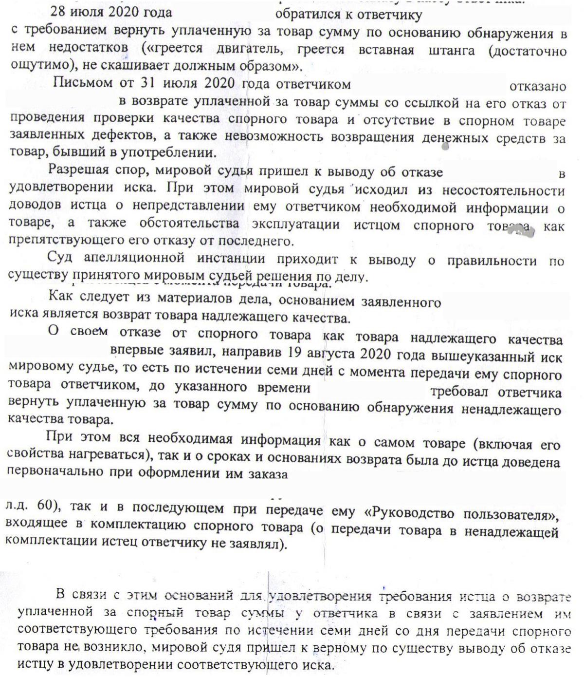 "Истец после покупки товара у ответчика, решил проверить купленный им товар. Для этого истец 27.07.2020 года начал проверку купленного им товара. В результате проверки истцом купленного у ответчика товара, было установлено, что товар который им был куплен не подходит для тех целей для которых он приобретался. Истцом было установлено, что купленный им товар сильно греется через непродолжительное время (двигатель, вставная штанга), что делает неудобным использование данного товара потребителем, товар не удобен в использовании для прямого назначения, кроме того, товар не скашивает должным образом. В связи с установлением потребителем вышеуказанных обстоятельств, истец 28 июля 2020 года написал ответчику заявление о возврате товара и возвращении ему денежных средств уплаченных за товар, что подтверждается копией заявления приложенного к настоящему иску."