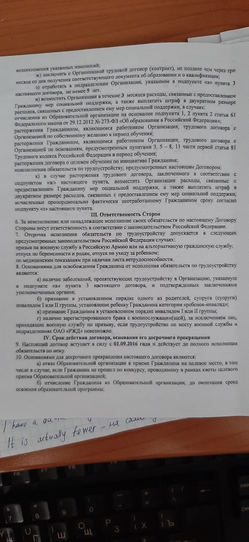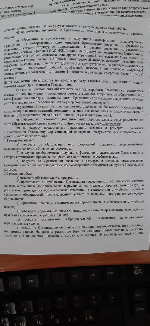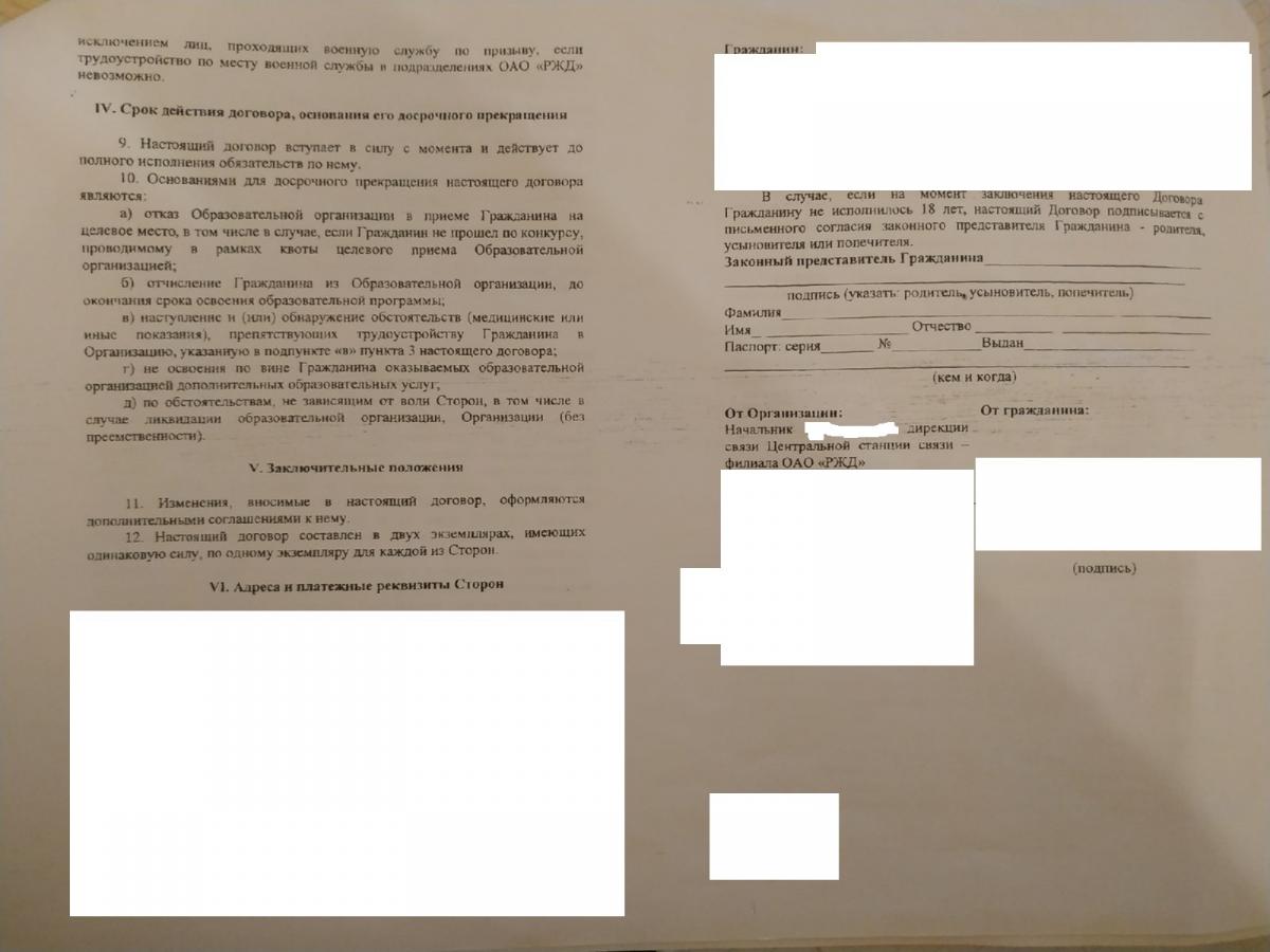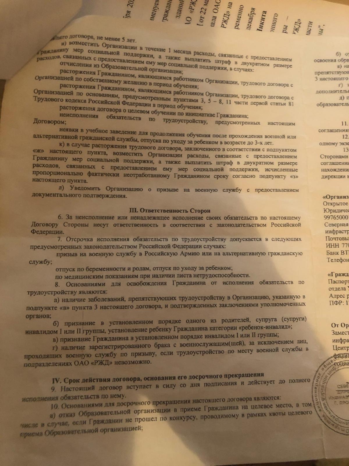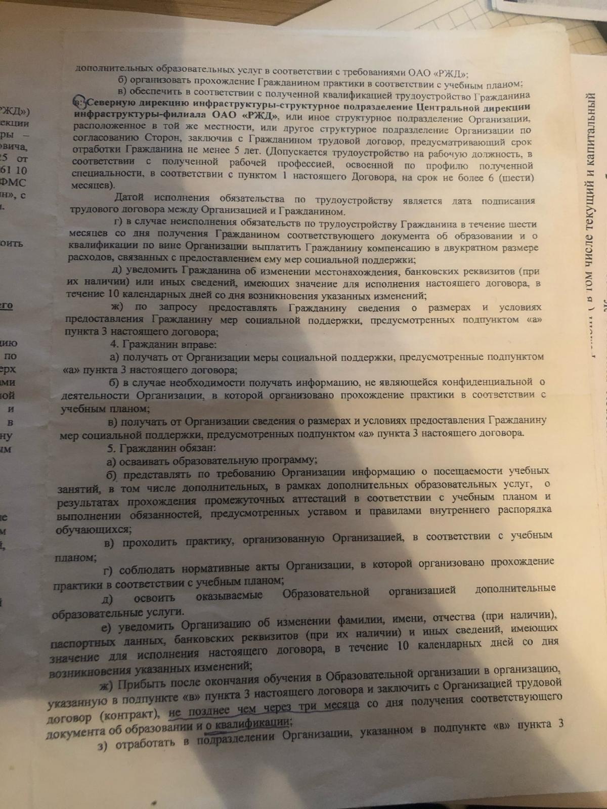 Сын сейчас не хочет отрабатывать 5 лет. Так как при подписании договора нам обещали, что он будет работать по профессии инженером (даже показали кабинет, в котором он будет работать). Что по факту. В договоре написано, что РЖД предоставит нам место работы, но не указано кем. Теперь же они говорят, что никто ему не даст эту должность, он будет работать на низшей должности осмотрщиком путей (ходить по колесам молоточком стучать). Есть какие то внутренние правила, по которым они так и делают. ЗП там минимальная, из которой ещё будут вырывать деньги за обучение. Конечно же этот вариант нас не устраивает, поэтому будем разрывать договор. Ищем какие-то зацепочки, чтобы хоть немного минимизировать эту выплату.