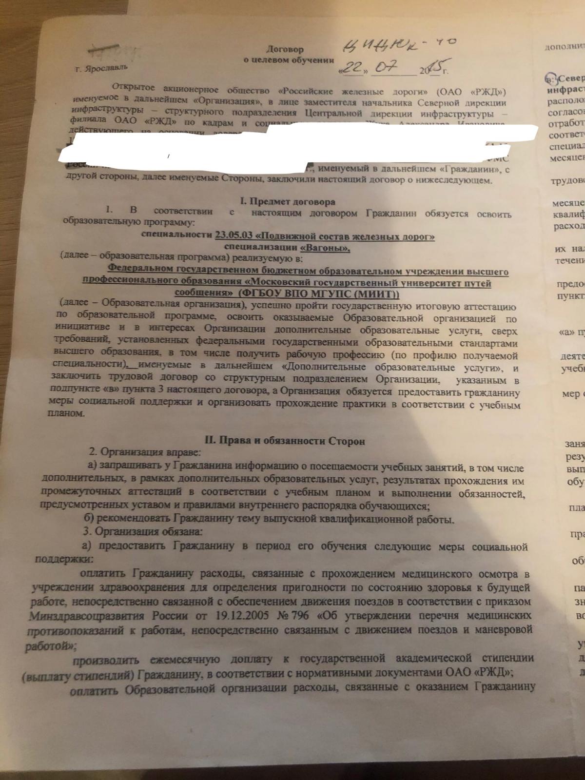 Сын закончил МИИТ Это университет от РЖД. Поступали туда по целевому направлению. Подписывали договор, в котором написано, что он должен отработать 5 лет после окончания обучения. Если мы разрываем договор, то должны выплатить всю сумму за обучение, все выплаты (стипендии) и штраф в двукратном размере. Нам насчитали порядка полумиллиона рублей, если мы отказываемся от отработки.