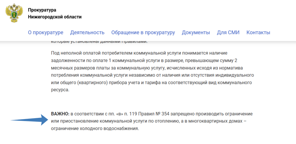 Порядок ограничения или приостановления предоставления коммунальных услуг установлен пунктом 119 Правил N 354.