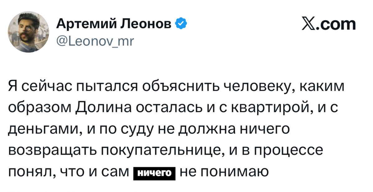 При безнале, кстати, аргумента бы не было. Здесь я не понимаю риелторов. но Долина СО СВОИХ риелторов три млн. "получила обратно". Ну прелесть что за "артистка". Сначала своим же заявляла, что хочет продать, затем - "верните взад" (сорри).
