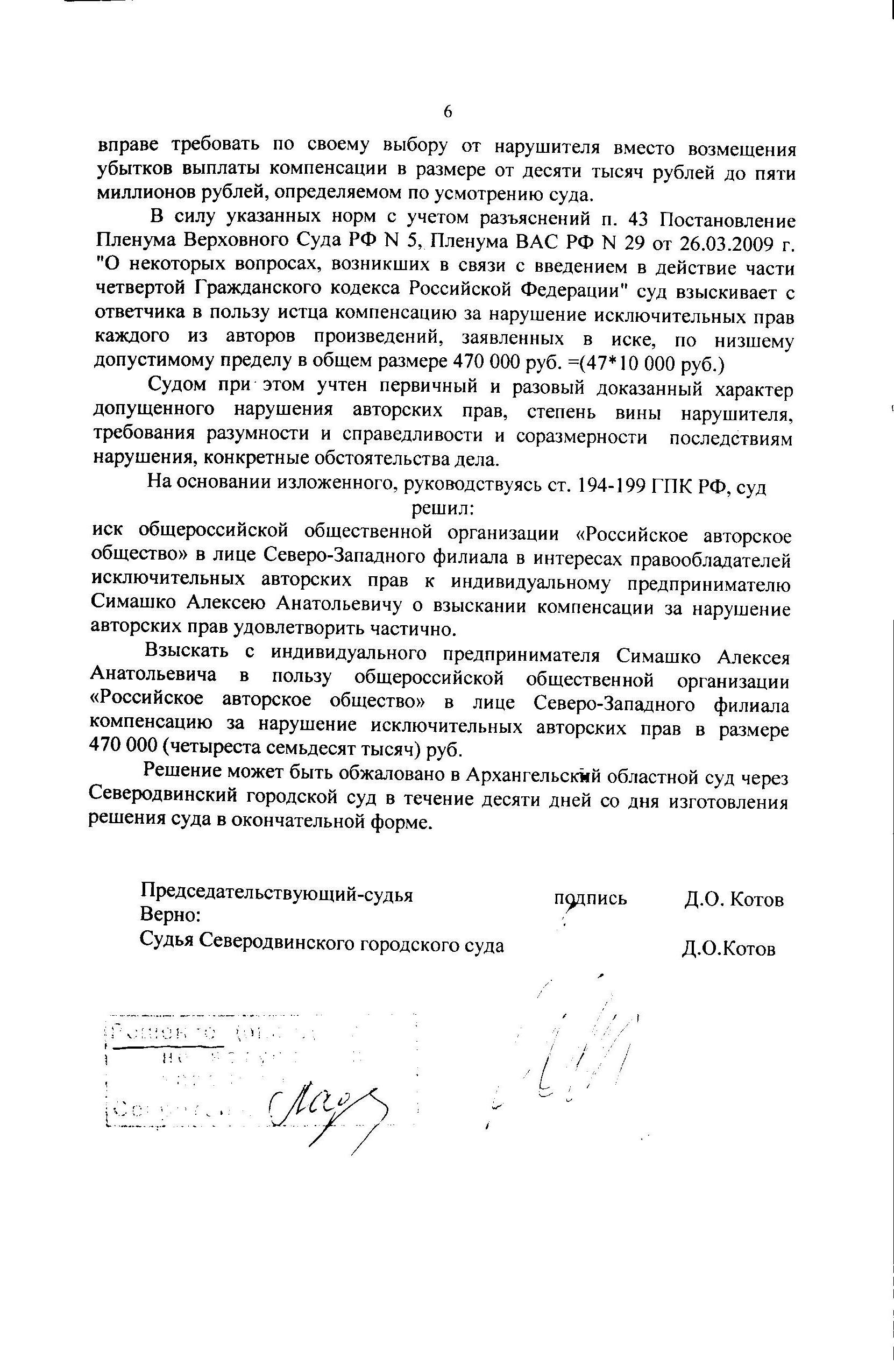 Кассация вас замочит не глядя, так что можете лишь пободаться про размер компенсации, хотя шансов - ноль. Ну и если у вас там было действительно караоке, а не оригинальные версии, то можно поспорить насчет нарушенных прав авторов текста, который запросто был изменен не по вашей вине, а по вине пьяных посетителей. Или вообще не прозвучал в смысле того, что то, что вы организовывали, было лишь исполнением караоке, а не наймом пьяных посетителей для распевания песен.