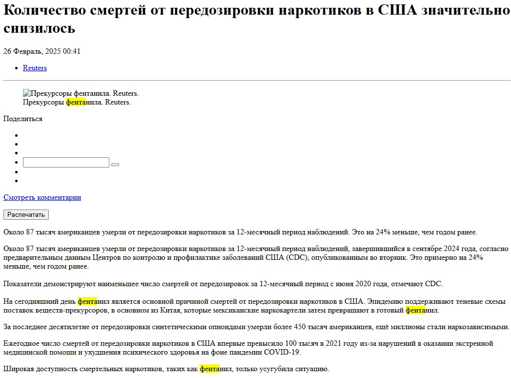 Вроде в США из Китая в огромных количествах поступает фентанил (и его прекурсоры), который на первом месте по причине смертоности.